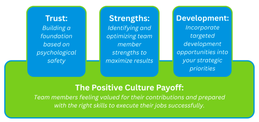 When you invest in these three pillars (Trust, Optimization, and Intentional Development) the cumulative result is a positive and resilient culture. This culture is not about the snacks in the kitchen; it is simply how work gets done. A positive culture is one where people feel valued for their contributions, are prepared with the right skills to execute their jobs and are safe to learn from mistakes.